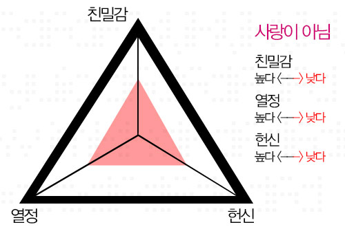 열정(passion) 기본적인 욕구, 상대와 같이 있고 싶어 하는 기분 등 적극적으로 상대와 관계하려는 동기가 되는 요소