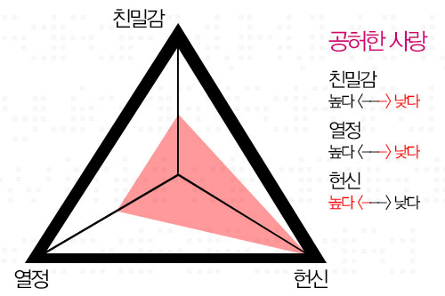 미국의 심리학자 스텐버그(Robert Sternberg)는 사랑의 삼각형 이론으로 친밀감, 열정, 헌신의 3가지 요소로 성립한다고 하고 이들의 조합에 따라 8가지 형태로 분류했습니다