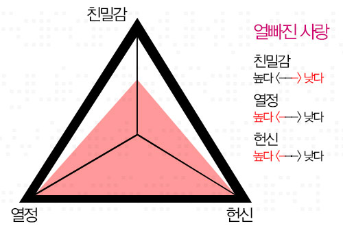 미국의 심리학자 스텐버그(Robert Sternberg)는 사랑의 삼각형 이론으로 친밀감, 열정, 헌신의 3가지 요소로 성립한다고 하고 이들의 조합에 따라 8가지 형태로 분류했습니다