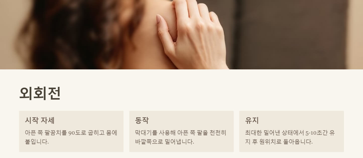※ 처음에는 약간의 불편함을 느낄 수 있지만, 꾸준히 하면 어깨의 회전 범위가 크게 개선되는 것을 경험할 수 있습니다.