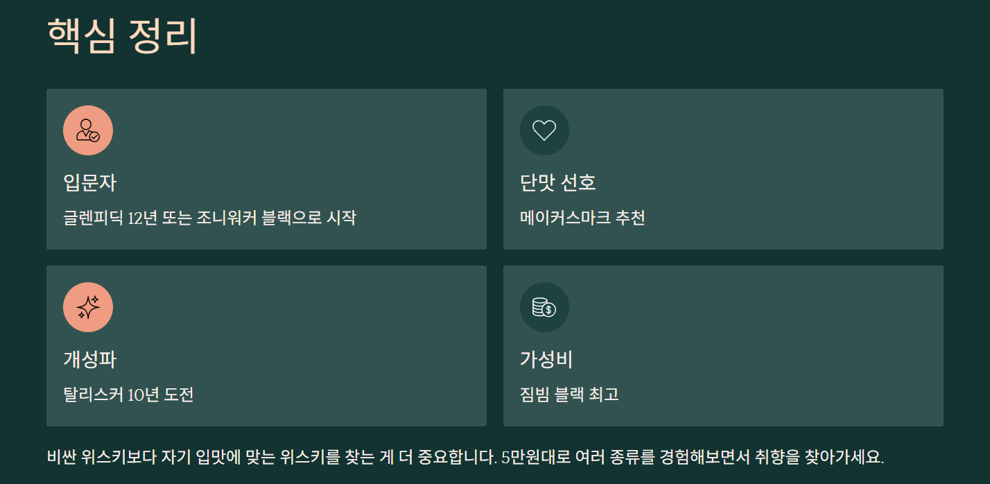 제 경험상 비싼 위스키보다 자기 입맛에 맞는 위스키를 찾는 게 더 중요하더라고요. 5만원대로 여러 종류 경험해보면서 취향 찾아가시길 바랄게요.