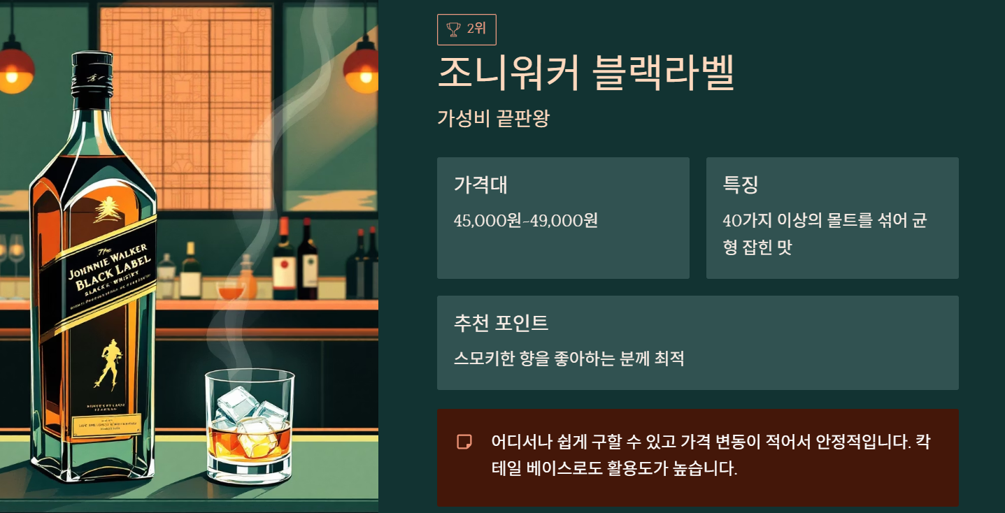 | 조니워커 블랙 | 45,000~49,000원 | 블렌디드 | 만능형 | 모든 방식 |