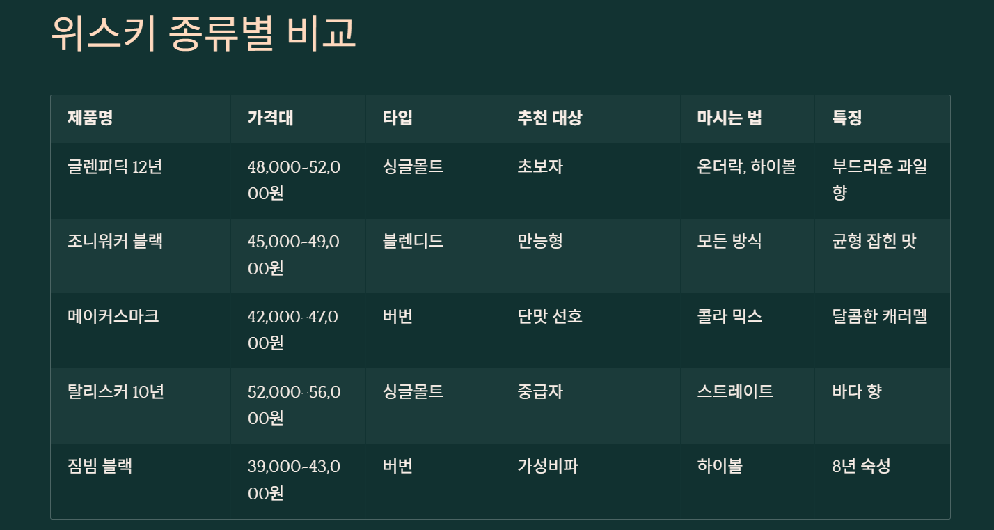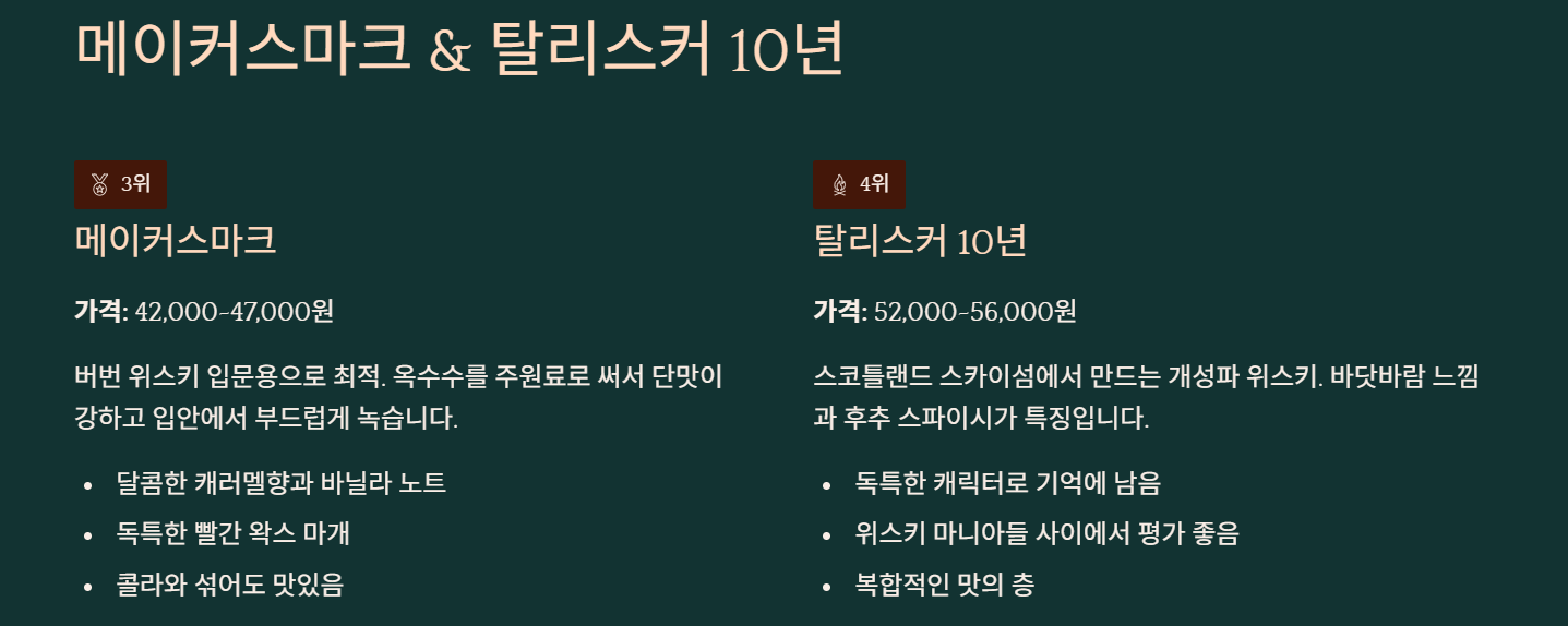 | 탈리스커 10년 | 52,000~56,000원 | 싱글몰트 | 중급자 | 스트레이트 |