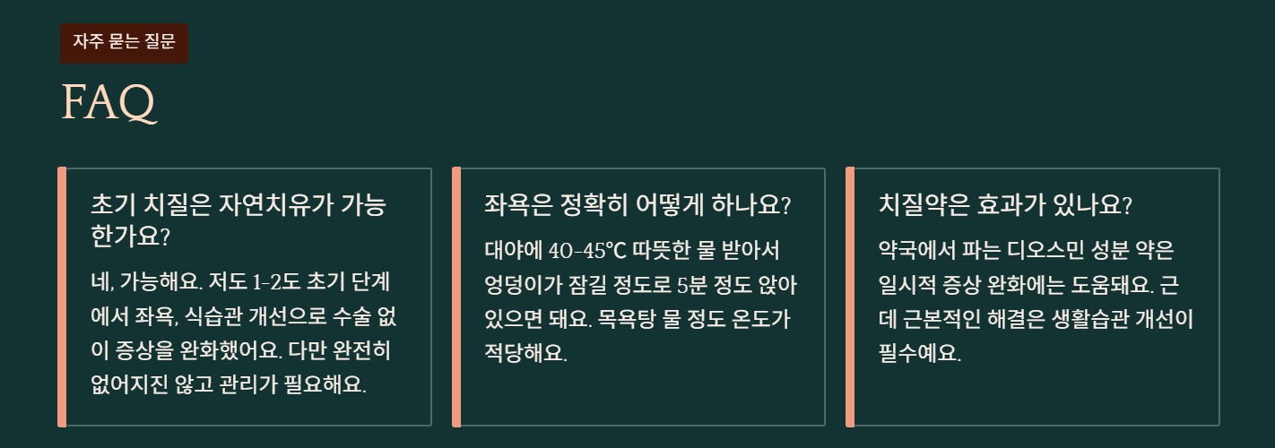 | 온수 좌욕 (하루 2-3회) | ★★★★★ | 무료 | 높음 | 가장 효과 좋았어요 |