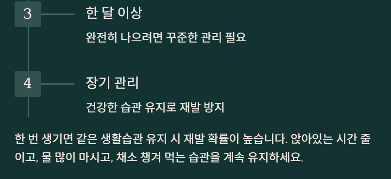 A6. 한 번 생기면 같은 생활습관 유지하면 재발 확률 높아요. 저는 지금도 앉아있는 시간 줄이고, 물 많이 마시고, 채소 챙겨 먹는 습관 유지하고 있어요. 가끔 증상 느껴지면 바로 좌욕해요.