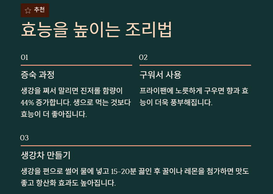 생강은 생으로 먹는 것보다 쪄서 말려 먹으면 효능이 더 좋아지며, 증숙 과정에서 진저롤 함량이 44% 증가합니다. 프라이팬에 노릇하게 구워서 사용해도 좋아요.