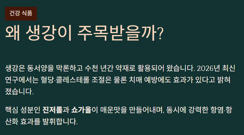 수천 년 동안 동서양을 막론하고 약재로 활용되어 온 식품입니다. 2026년 1월 발표된 최신 연구에서는 생강이 혈당과 콜레스테롤 조절은 물론 치매 예방에도 도움을 줄 수 있다고 밝혀졌어요.