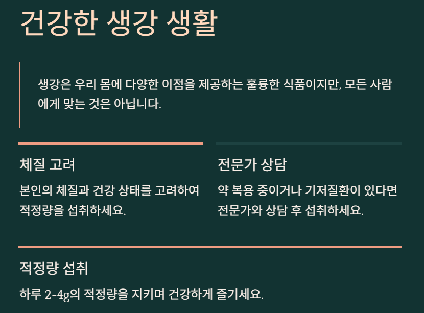 생강 효능 및 부작용과 제대로 먹는법에 대해 말씀드렸는데요. 우리 몸에 다양한 이점을 제공하는 훌륭한 식품이지만, 모든 사람에게 맞는 것은 아닙니다. 본인의 체질과 건강 상태를 고려하여 적정량을 섭취하는 것이 중요해요. 특히 약을 복용 중이거나 기저질환이 있다면 전문가와 상담 후 섭취하시길 권장합니다.