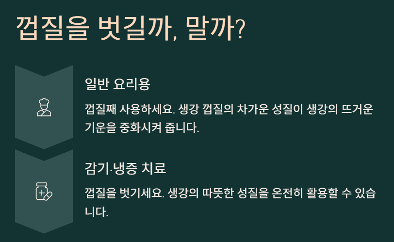 일반 요리용: 껍질째 사용하는 것이 좋아요. 생강 껍질은 차가운 성질로 생강의 뜨거운 기운을 중화시켜 줍니다.