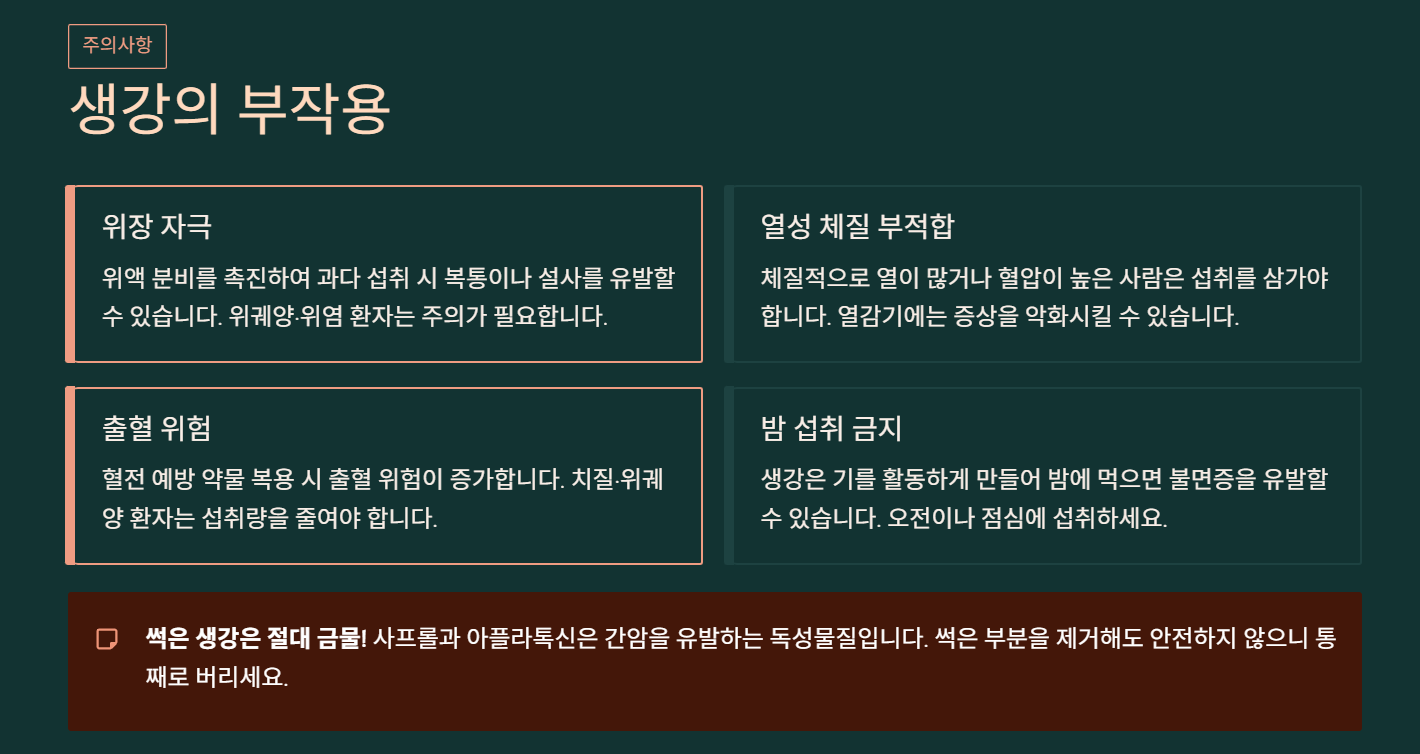 생강 부작용으로 위액 분비를 촉진하여 위 점막을 자극할 수 있어, 한 번에 너무 많은 양을 섭취하면 복통이나 설사를 유발할 수 있습니다. 위궤양이나 위염이 있는 분들은 특히 주의가 필요해요.