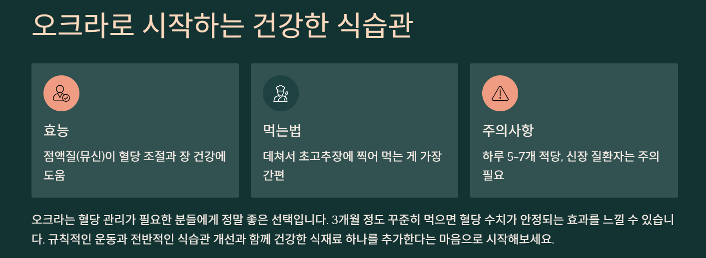 물론 오크라만으로 모든 게 해결되는 건 아니에요. 규칙적인 운동과 전반적인 식습관 개선이 함께 필요하죠. 그래도 건강한 식재료 하나 추가한다는 마음으로 시작해보시면 좋을 것 같아요.