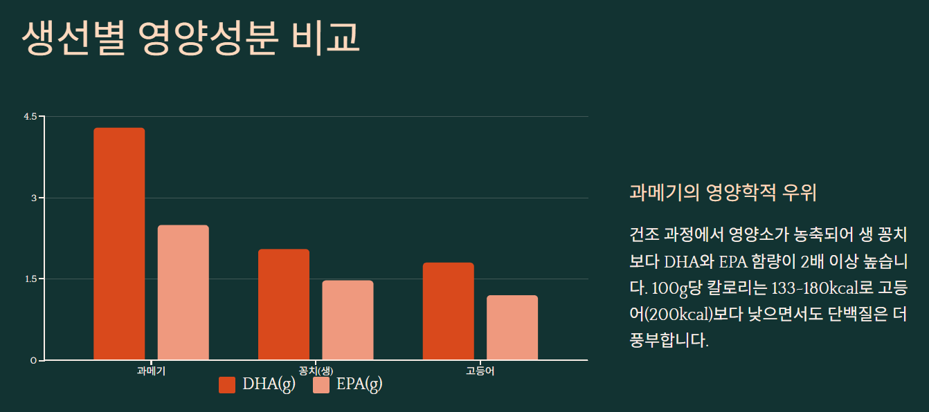 DHA는 뇌세포를 구성하는 주요 성분이에요. 과메기 100g에 약 4.29g이나 들어있는데, 이게 생 꽁치의 2배가 넘는 양이에요. 성장기 아이들 두뇌 발달에도 좋고, 어르신들 치매 예방에도 도움이 된다고 해요.