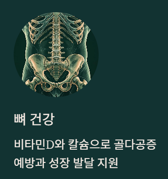 | 뼈 건강 | 비타민D, 칼슘 | 골다공증 예방, 성장 발달 |