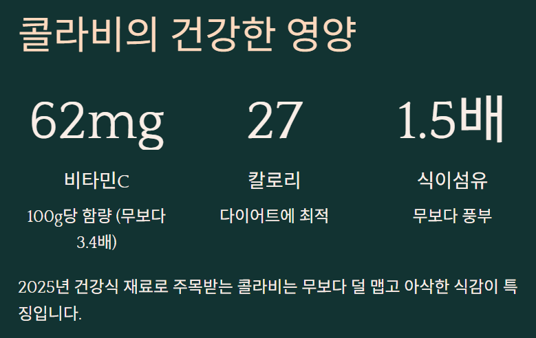 무보다 식이섬유가 1.5배 많고, 비타민C가 풍부해서 2025년부터 건강식 재료로 주목받고 있어요. 농촌진흥청 자료 보니까 콜라비는 100g당 비타민C가 62mg으로 무(18mg)보다 훨씬 많대요. 게다가 칼로리는 27kcal밖에 안 돼서 다이어트하는 분들한테도 좋고요.