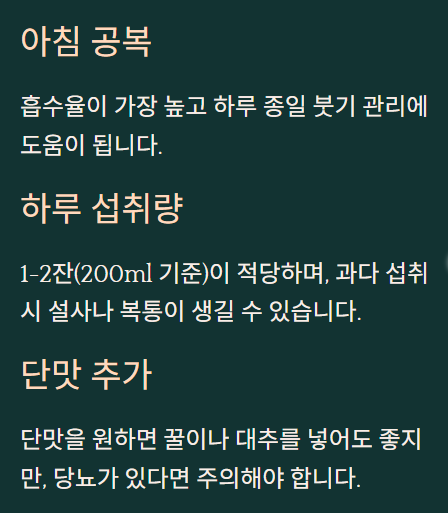 A. 아침 공복이 가장 좋아요. 흡수율도 높고 하루 종일 부기 관리에 도움이 돼요.