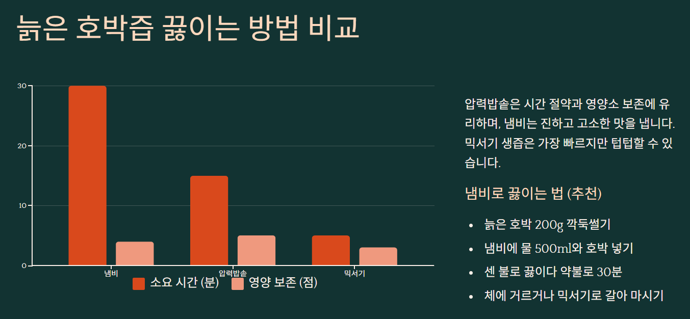 💡 늙은 호박죽 만드는 방법? 호박 500g에 물 3컵, 약불 30분이 정답! 핵심 정보끓이는 시간: 약불 30분적정 비율: 호박 500g당 물 3컵단맛 조절: 꿀이나 설탕 2-3스푼아침 식사로 뭘 먹을까 고민하다