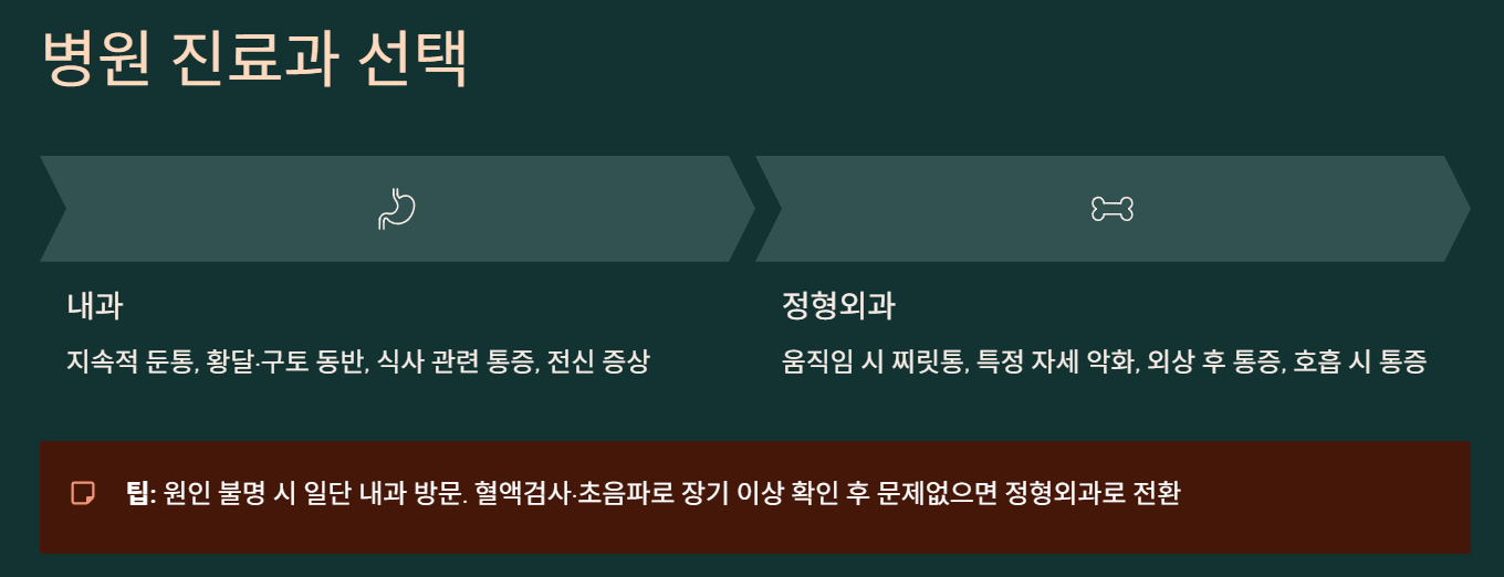 • 방문 진료과: 내과(장기 의심), 정형외과(근육·골격 의심)