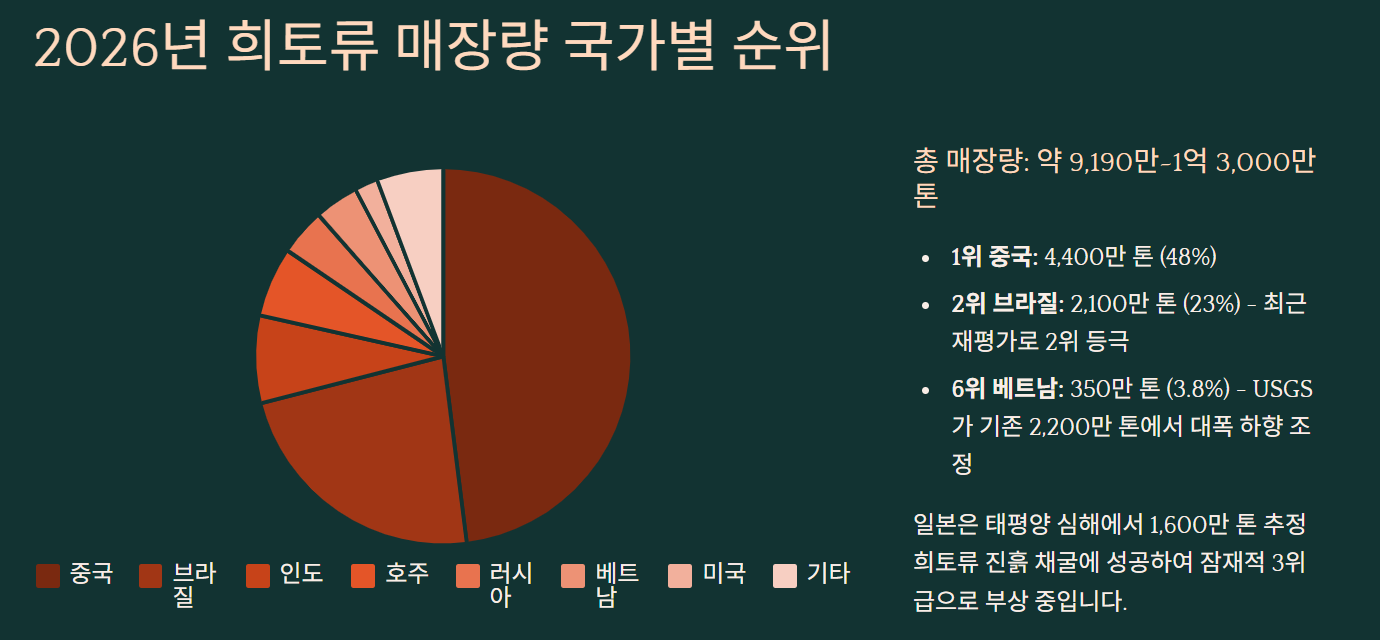 여기서 주목할 점이 있어요. 베트남이 원래 2위 국가로 알려졌었는데, 2025년 말에 미국 지질조사국이 베트남 매장량 추정치를 2,200만 톤에서 350만 톤으로 대폭 줄였거든요. 그래서 브라질이 2위로 올라섰죠.