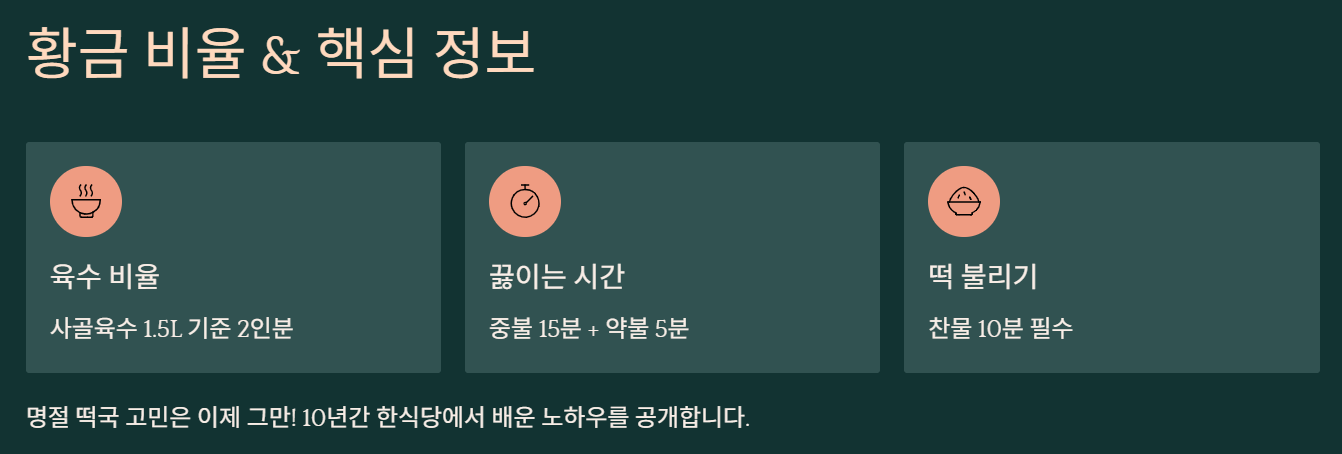 💡 떡국 맛있게 끓이는 법? 사골육수 1.5L + 가래떡 300g + 양념장 2큰술이 2인분 황금비율