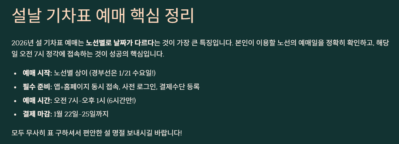 💡 2026년 설날 기차표 예매 일정? KTX 예매는 1월 19일(월)~21일(수) 노선별 진행, 설 연휴는 2월 16일~18일(3일)입니다.