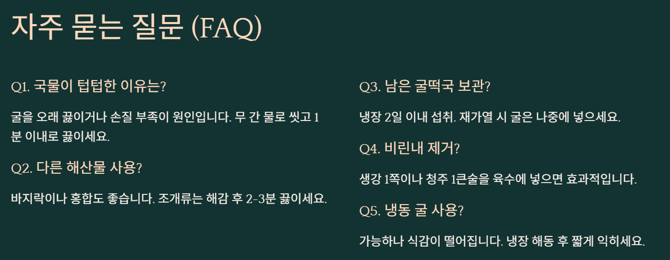 A1. 굴을 너무 오래 끓이거나 손질을 제대로 안 해서 그래요. 무 간 물로 깨끗이 씻고, 끓는 시간을 1분 이내로 줄이면 해결돼요.
