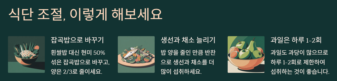 솔직히 밥 줄이는 게 제일 힘들었어요. 그래서 흰쌀밥을 현미 50% 섞은 잡곡밥으로 바꾸고, 양은 2/3로 줄였어요. 대신 반찬으로 생선이랑 채소를 더 먹었죠.