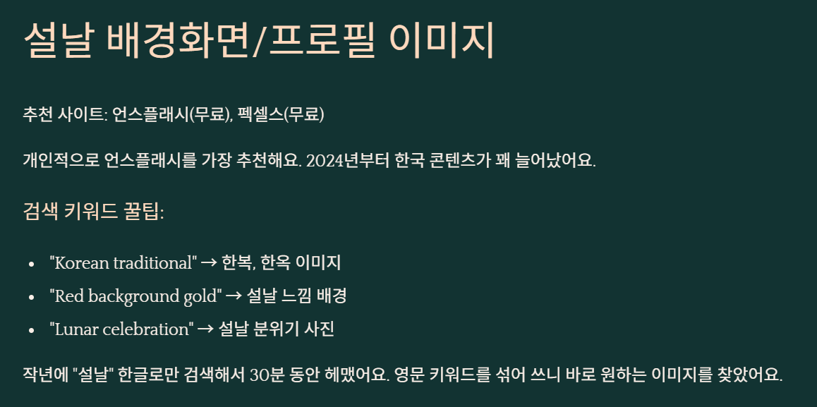 작년에 실패했던 경험 하나 공유하면, "설날" 한글로만 검색해서 30분 동안 헤맸어요. 영문 키워드 섞어 쓰니까 바로 원하는 이미지 찾았어요.