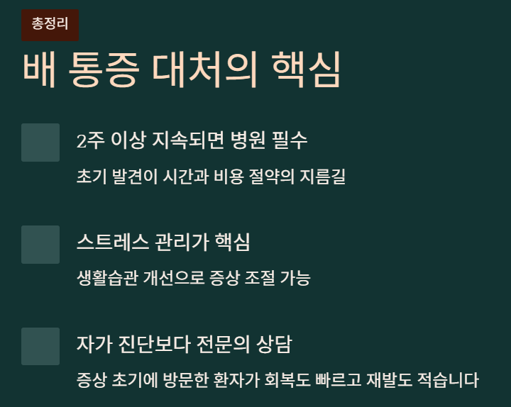 📌 배 통증 초기 대처법 3줄 정리