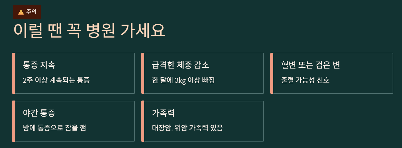 | 악화 시점 | 스트레스 시 | 공복/커피 후 | 식사 직후 |