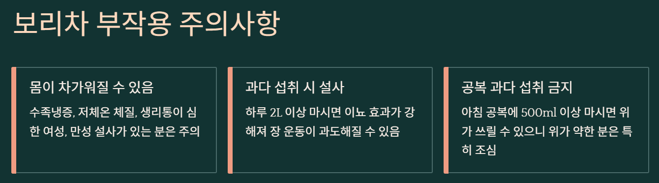 💡 보리차 효능 부작용? 체온 낮추고 부기 빼는 게 핵심, 하루 1.5L 적당하며 과다 섭취 시 속 냉함 주의