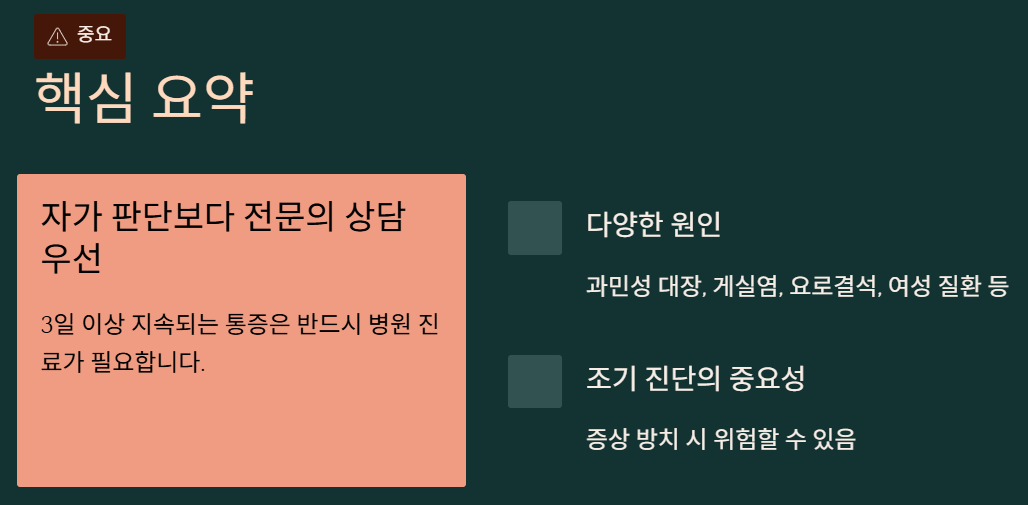 제가 병원 갔을 때 의사 선생님께서 말씀해주신 내용 중에, "통증의 양상과 동반 증상을 잘 살펴봐야 한다"는 게 가장 기억에 남아요. 그냥 아픈 게 아니라 언제, 어떻게 아픈지가 진단에 큰 도움이 된다고 하시더라고요.