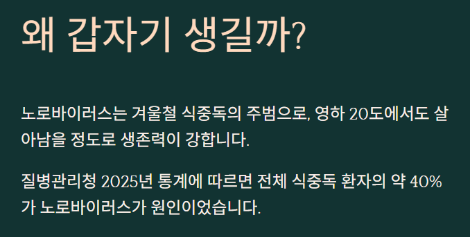 ✅ 증상: 갑작스러운 구토+설사, 12~48시간 잠복기