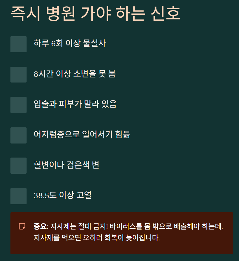 ✅ 병원: 하루 6회 이상 설사, 소변 감소 시 즉시