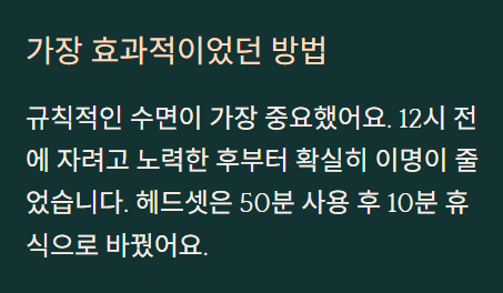 집에서: 잘 때 너무 조용하면 이명이 더 신경 쓰여요. 저는 선풍기 돌리거나 빗소리 ASMR을 작게 틀어놔요. 개인적으로 빗소리가 제일 좋았어요.