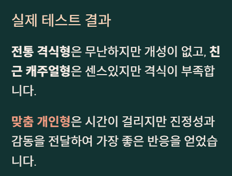 직접 해보니까 전통 격식형은 안전하긴 한데 너무 틀에 박힌 느낌이었어요. 반면 맞춤 개인형은 시간은 걸리지만 반응이 확실히 좋더라고요.
