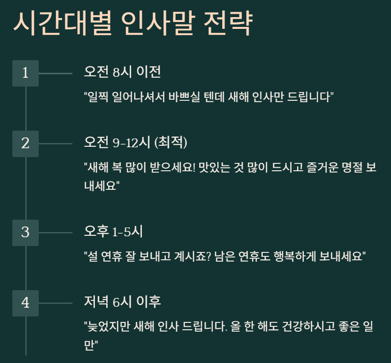 A1. 설날 당일 오전 9시-12시가 가장 무난해요. 너무 이른 아침은 부담스러울 수 있고, 오후 늦게는 늦은 인사로 보일 수 있어요.