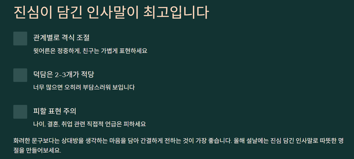 💡설날 인사말 좋은글? → 상대와 관계에 따라 격식을 조절하고, 건강·행복 등 진심 담긴 덕담을 2-3개 자연스럽게 넣으면 됩니다.