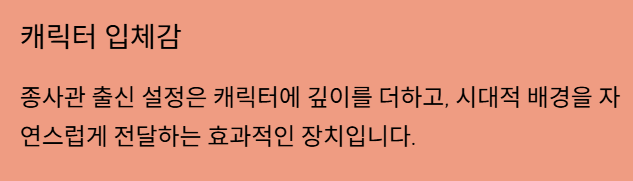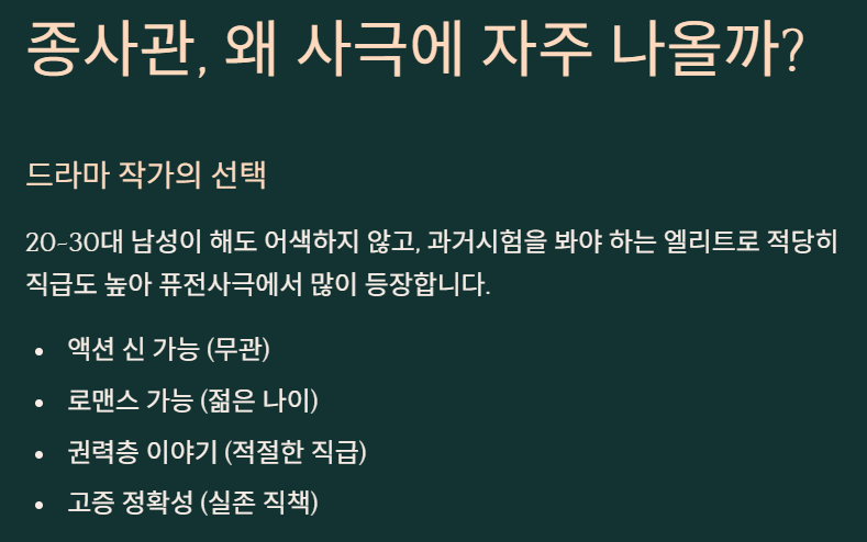 솔직히 드라마 작가 입장에서 생각해보면 되게 쓸모있는 설정이에요. 액션 신도 넣을 수 있고(무관이니까), 로맨스도 가능하고(젊으니까), 권력층 이야기도 다룰 수 있고(어느 정도 직급 있으니까). 게다가 실제로 그 시대에 존재했던 직책이라 고증도 맞고요.