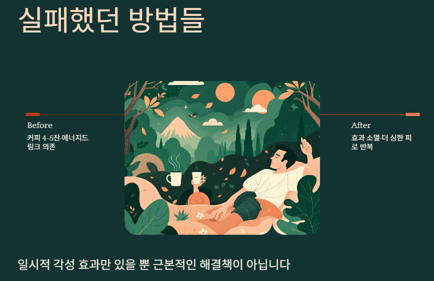 피곤할 때마다 에너지 드링크를 찾았는데, 효과는 1-2시간뿐이고 금방 다시 피로감이 몰려왔어요. 게다가 자꾸 찾게 되더라고요.