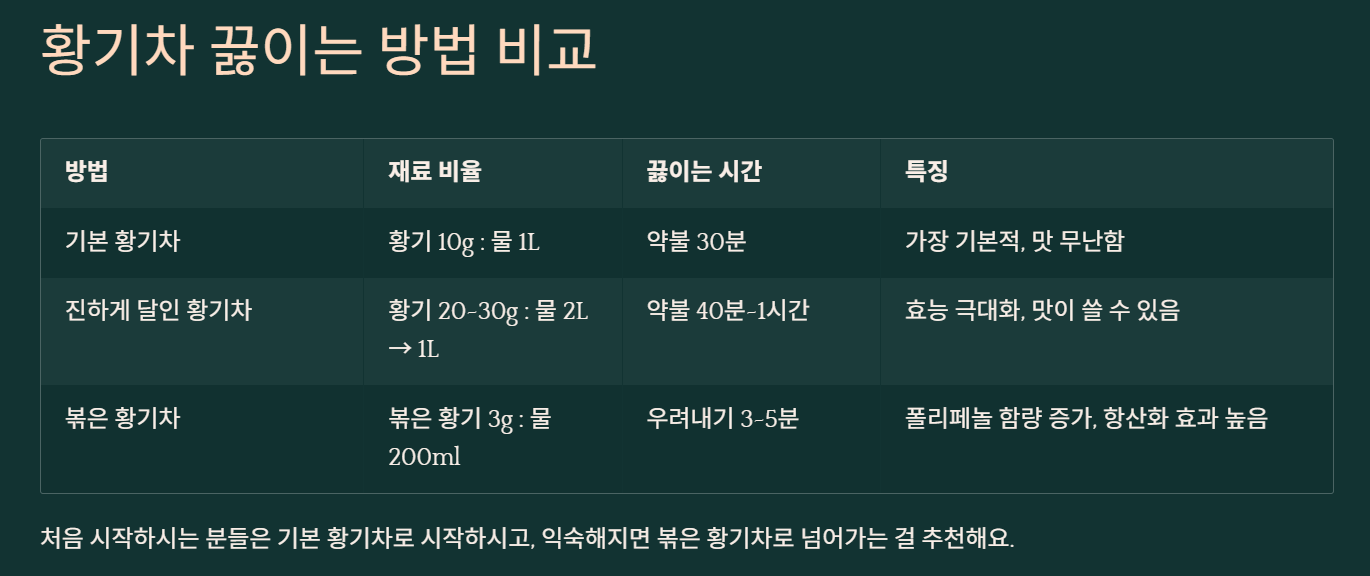 제가 직접 3가지 방법을 다 해봤는데요, 처음 시작하시는 분들은 기본 황기차로 시작하시고, 익숙해지면 볶은 황기차로 넘어가는 걸 추천해요. 진하게 달인 건 맛이 좀 강해서 호불호가 갈릴 수 있거든요.