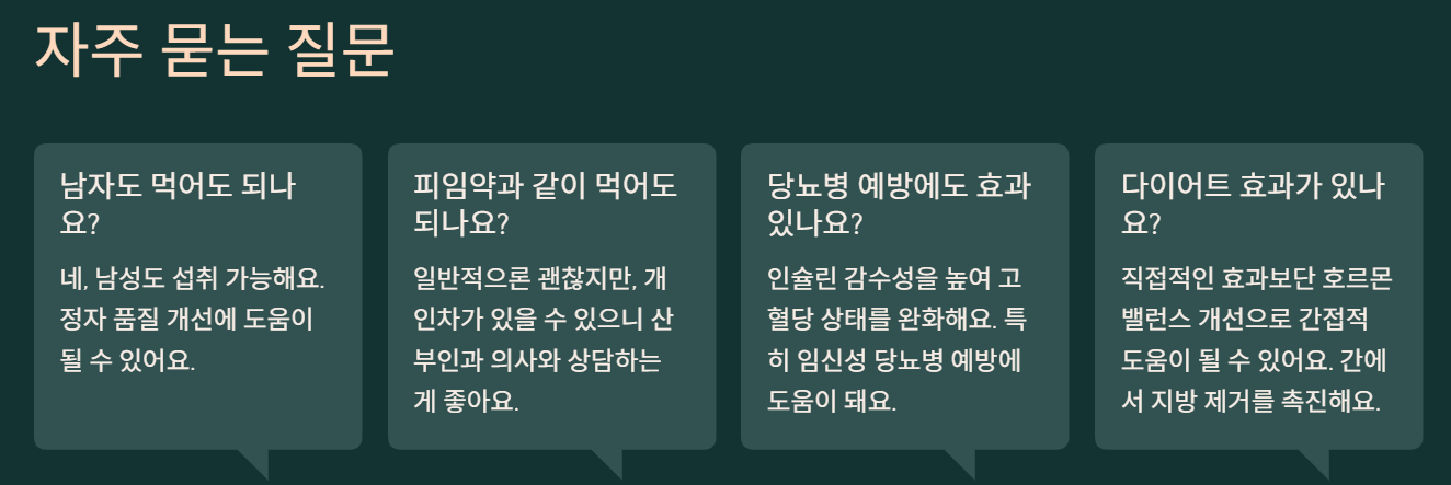 | 주요 효능 | PCOS 개선, 혈당 조절 | 간 건강, 지방 대사 |