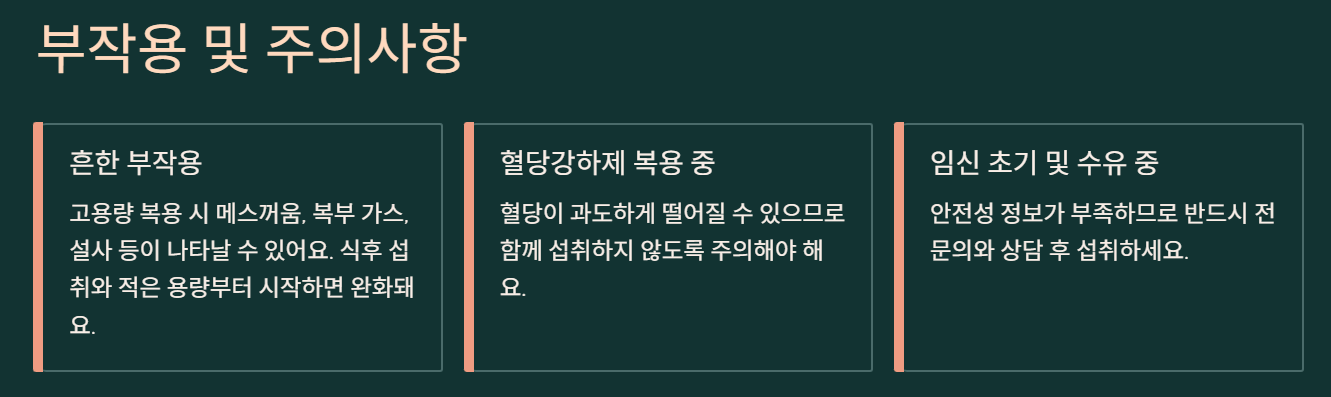 ⚠️ 주의: 고용량 시 소화불량, 혈당강하제와 병용 금지