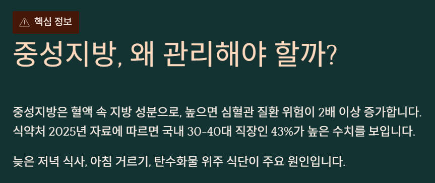 중성지방은 혈액 속 지방 성분인데, 높으면 심혈관 질환 위험이 2배 이상 올라간다고 해요. 식약처 2025년 자료에 따르면, 국내 30-40대 직장인 43%가 중성지방 수치가 높은 편이래요.