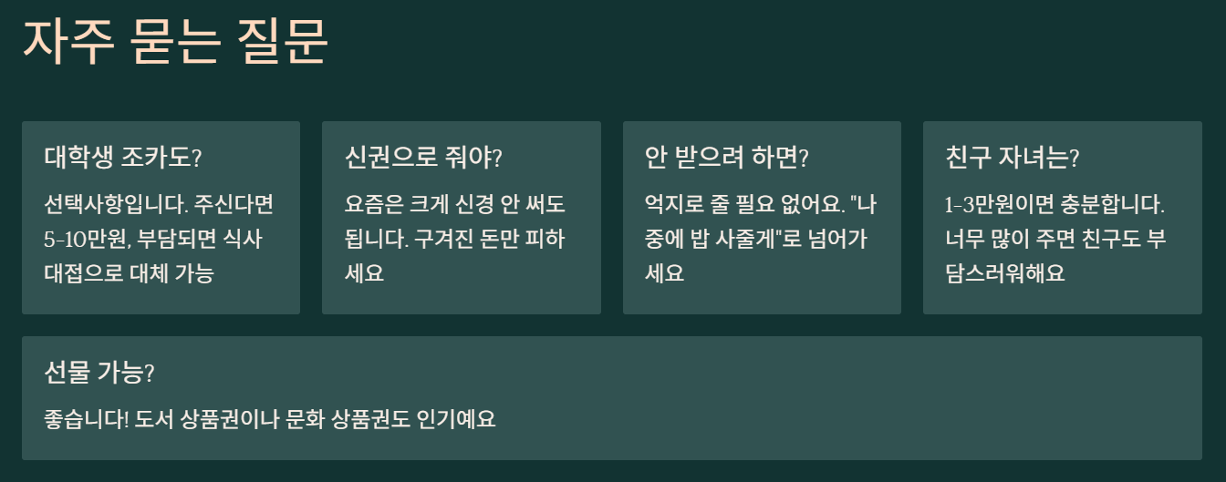 A1. 선택사항이에요. 주신다면 5-10만원 정도가 적당하고, 부담되면 식사 대접으로 대체해도 괜찮아요.