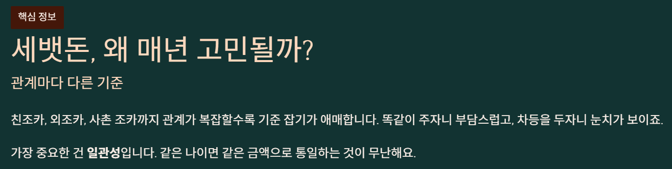개인적으로 저는 초등학생 조카들한테 5만원, 중학생 조카한테 7만원을 줘요. 물론 경제 사정에 따라 조절하면 되는데, 중요한 건 일관성이더라고요.