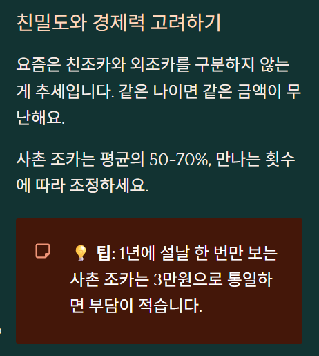 실제로 작년에 사촌 조카들한테 얼마를 줄지 고민했는데, 1년에 설날 한 번밖에 안 보거든요. 그래서 3만원으로 통일했어요. 솔직히 너무 많이 주면 부모님들도 부담스러워하시더라고요.