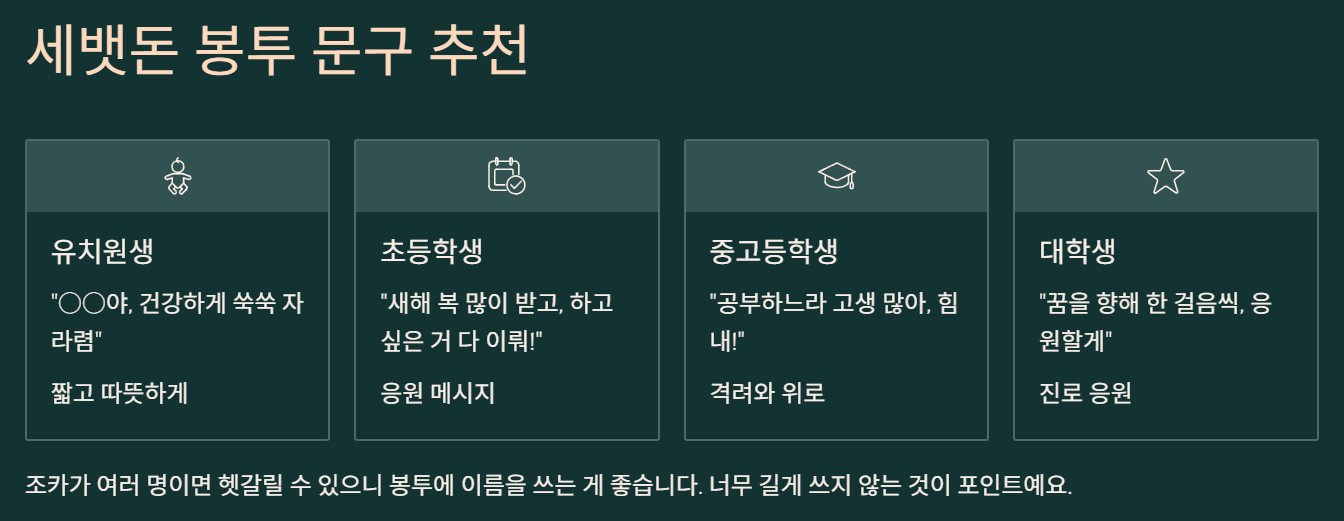 | 초등학생 | "새해 복 많이 받고, 하고 싶은 거 다 이뤄!" | 응원 메시지 |
