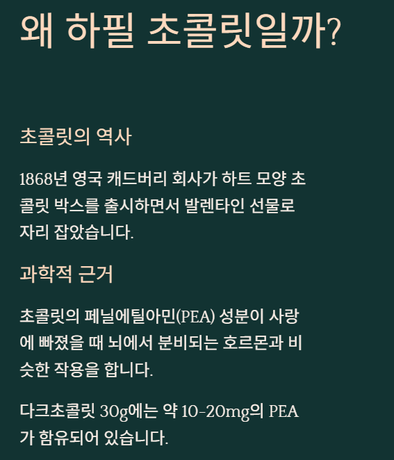 초콜릿에 들어있는 페닐에틸아민(PEA)이라는 성분이 사랑에 빠졌을 때 뇌에서 분비되는 호르몬과 비슷한 작용을 한다는 연구 결과도 있고요. 2025년 식품안전처 자료에 따르면, 다크초콜릿 30g에는 약 10-20mg의 PEA가 함유돼 있다고 해요.