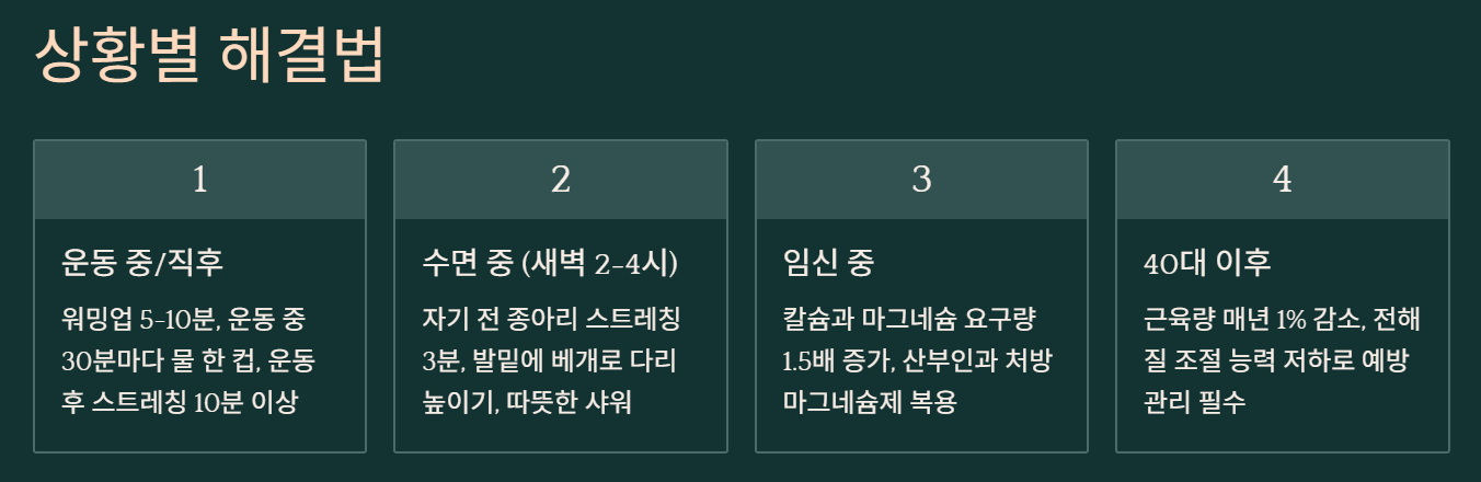 원인: 근육 과부하 + 땀으로 인한 전해질 손실