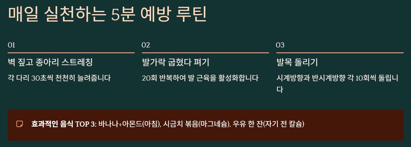 - 운동 후 스트레칭 10분 이상 (특히 종아리)